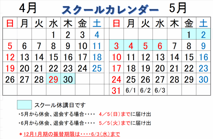 以下をスクールカレンダーでご確認ください。